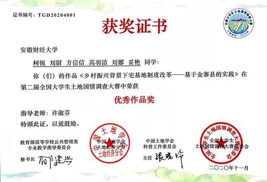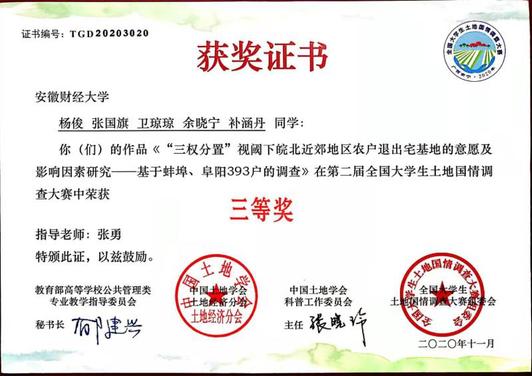 本次大赛共有来自中国人民大学、南京大学、浙江大学、东北大学、南京农业大学、安徽财经大学等多所国内知名高校组队参赛,大赛组委会评审确定46支参赛队伍入围决赛,26支参赛队伍获得优秀作品奖。我院张勇老师指导土地资源管理专业2018级本科生杨俊、张国旗组建“安财土管皖北队”,提交作品“三权分置视阈下皖北近郊地区农户退出宅基地的意愿及影响因素研究——基于蚌埠、阜阳393户的调查”,入围决赛并在决赛中荣获三等奖;许淑芬老师指导土地资源管理专业2018级本科生柯锐组建“金寨宅改小队”,提交作品“乡村振兴背景下宅基地制度改革——基于金寨县的实践”,荣获优秀作品奖。同时,我校在本次大赛中荣获“最佳组织奖”。