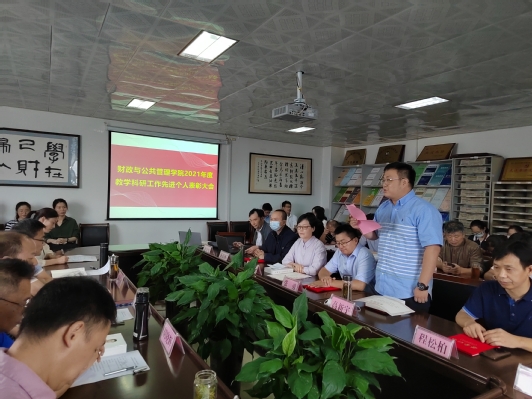 9月14日下午,财政与公共管理学院2021年度教学科研业绩先进个人表彰大会在学院会议室召开,学院党政领导及全院教师参加了本次表彰大会。会议由党委副书记汪芳芳主持。