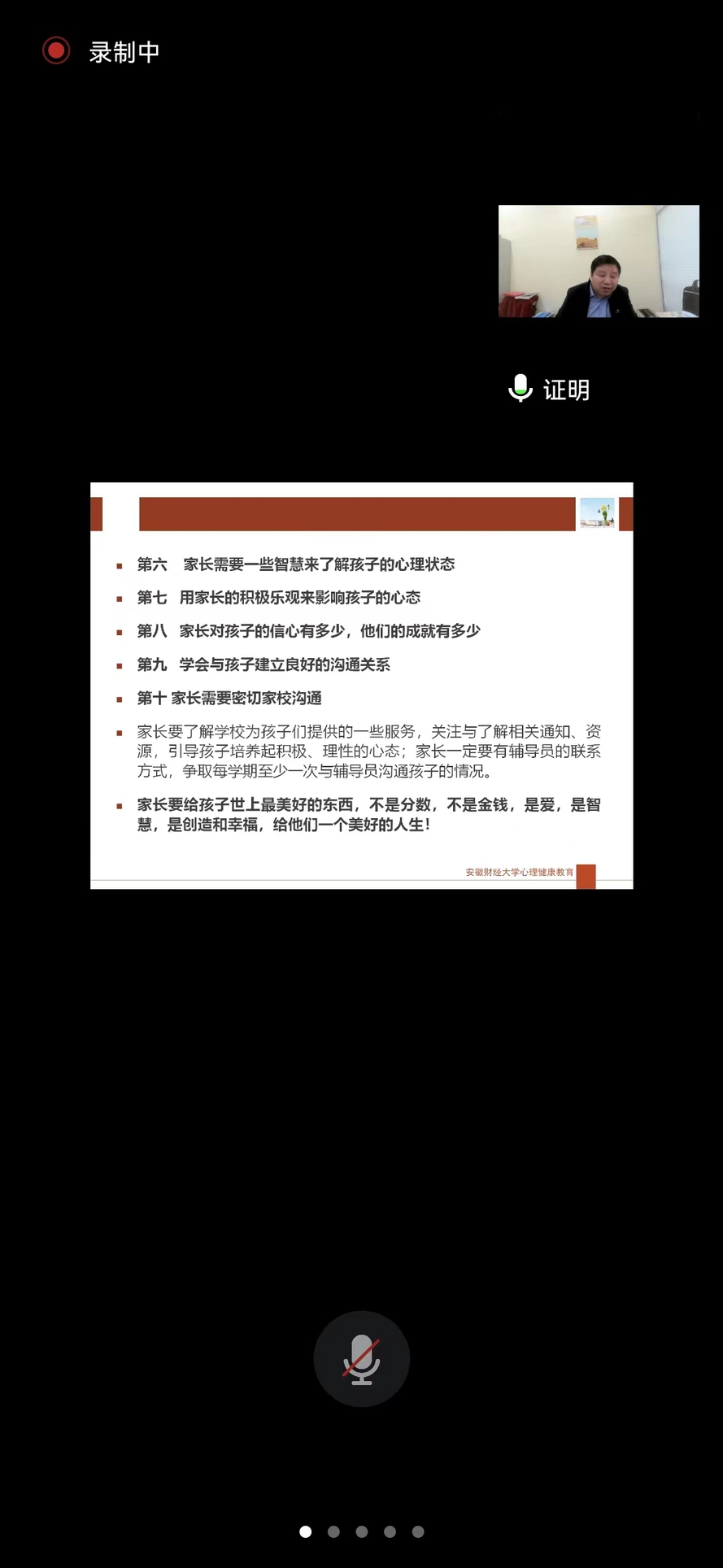 尹明证从六个层次、三个维度对大学生心理健康现状、家校共育重要性、新时代家庭功能的有效发挥进行深入分析,向家长普及大学生心理健康的知识,帮助家长了解沟通的基本方法,更新家校共育的系统观、发展观。讲座中,尹老师与家长交流探讨了适度参与、接纳包容、支持理解的新实践,以期发挥学校、家庭教育的各自优势,为学生成长成才提供促进性的环境,共同营造学生全面发展、健康成长的良好氛围。