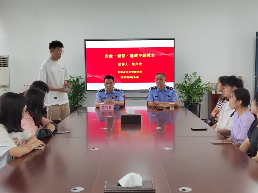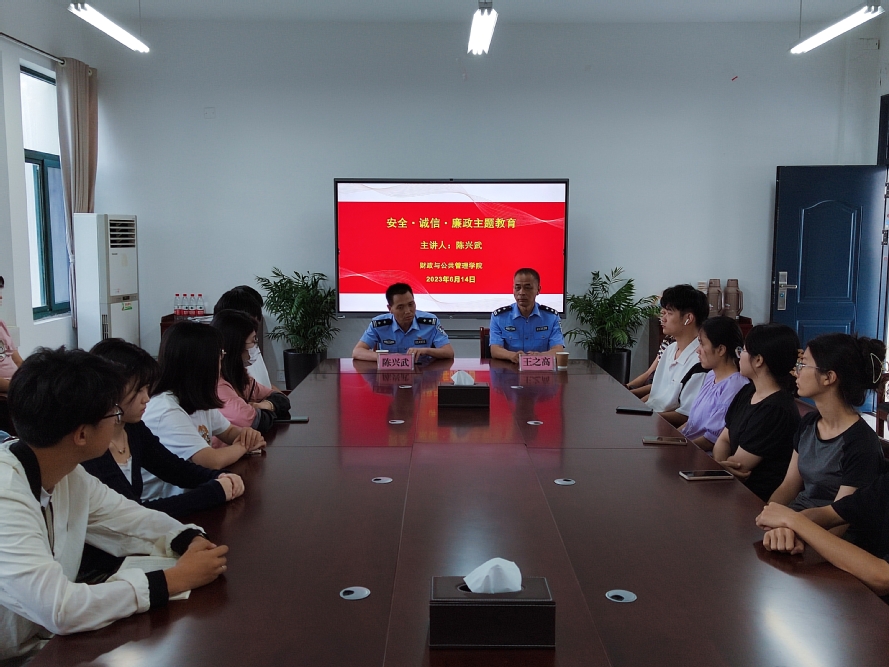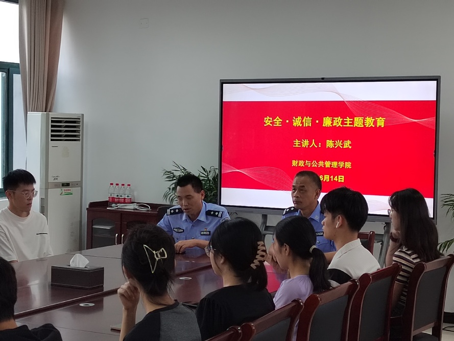 为切实增强广大学生诚信廉洁从业意识,积极营造安全和谐、健康向上校园氛围,提高学生防范和应对电信诈骗的意识和能力,6月14日下午,财公学院邀请蚌埠市龙湖派出所所长陈兴武、副所长王之高作“安全·诚信·廉政”主题教育讲座,学院学生干部代表和2023届部分毕业生参加讲座。