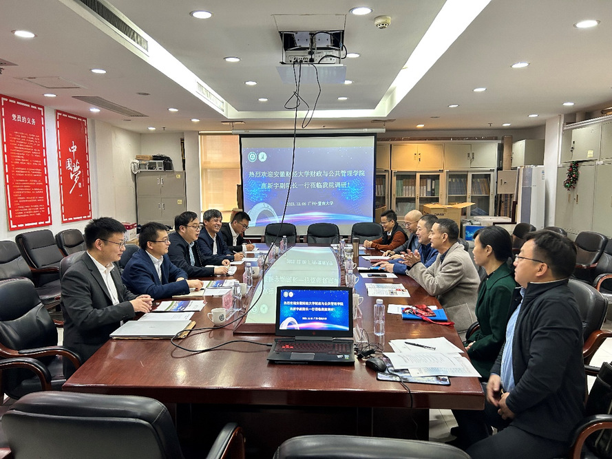 廖勇和戴胜利对我院一行到访表示热烈欢迎。廖勇介绍了暨南大学党建工作的特色和亮点。戴胜利介绍了暨南大学公共管理学院的办学基本情况。高新宇介绍了安徽财经大学财政与公共管理学院的基本情况以及学院近年来取得的各项成果。随后,双方各系部主要负责人就各个专业的发展建设、人才培养、教学科研等方面的工作进行了深入讨论和交流,双方表示将以此次合作为起点,持续加强沟通交流,不断扩大学院之间的合作交流。