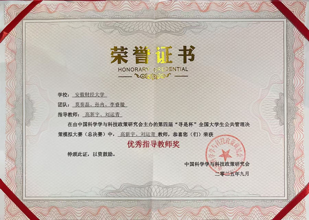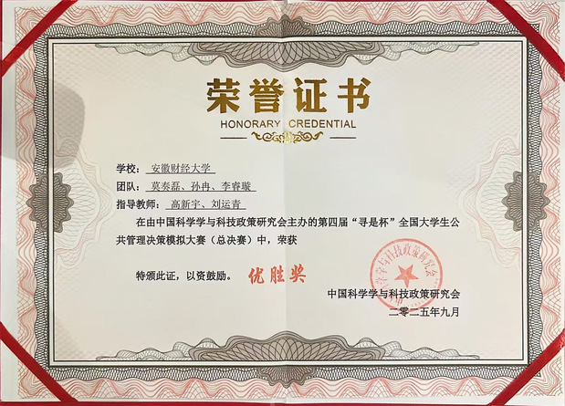 我院行政管理系2023级莫奏磊、孙冉、李睿璇三位同学组成的“知行合一”小队与北京大学、南京大学、复旦大学、西安交通大学等全国各地100所高校的队伍进行角逐。比赛过程中,参赛队伍以“公共治理创新”为核心,深入分析城市背景信息,结合国家政策导向,运用系统思维展开模拟决策,灵活调整策略,最终荣获学生团队荣获全国“优胜奖”。高新宇、刘运青获“优秀指导老师奖”。